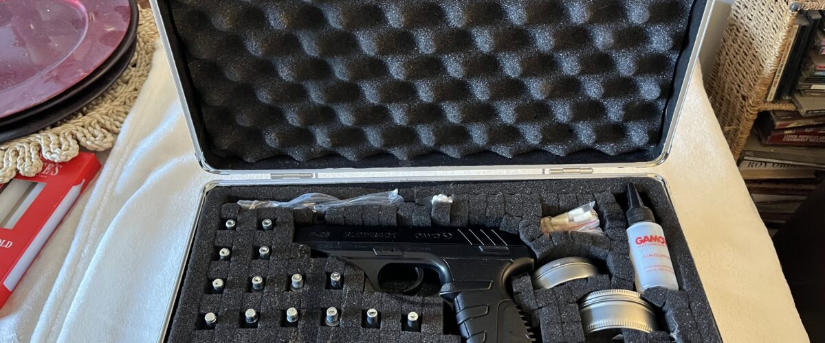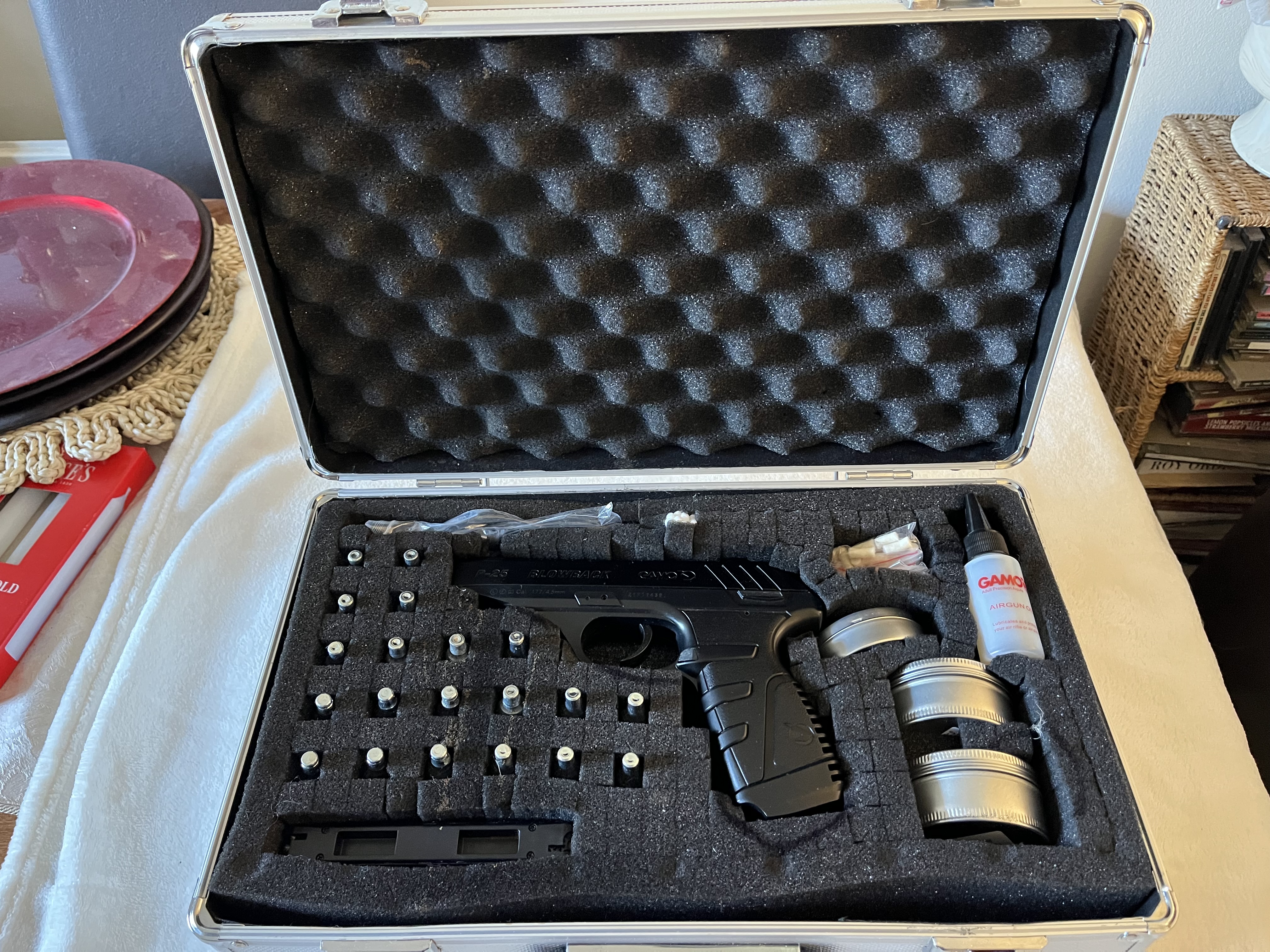 bottles, lots of .177 pellets, a protective storage/carry case, GAMO air gun oil and a set of cleaning rods.