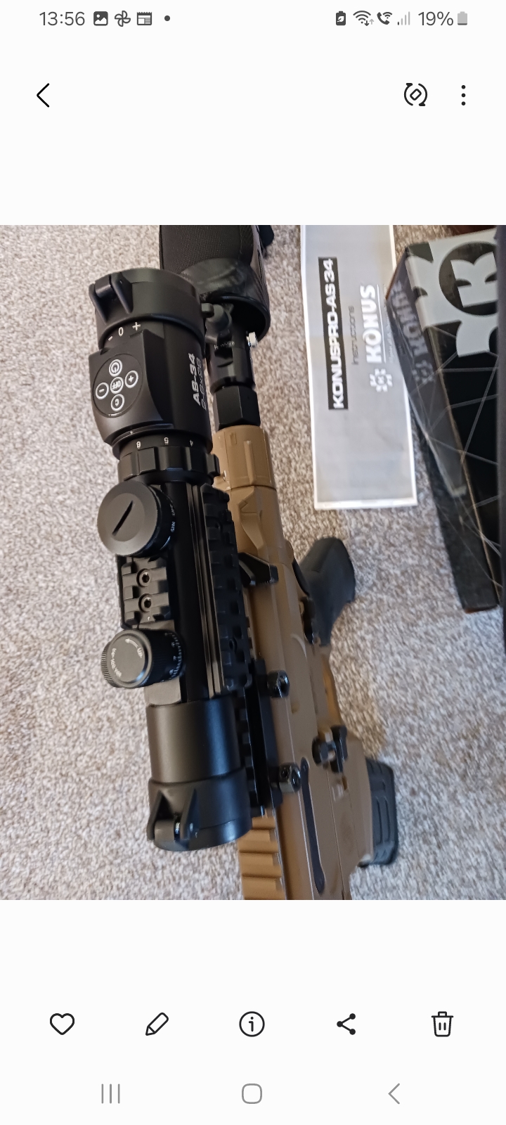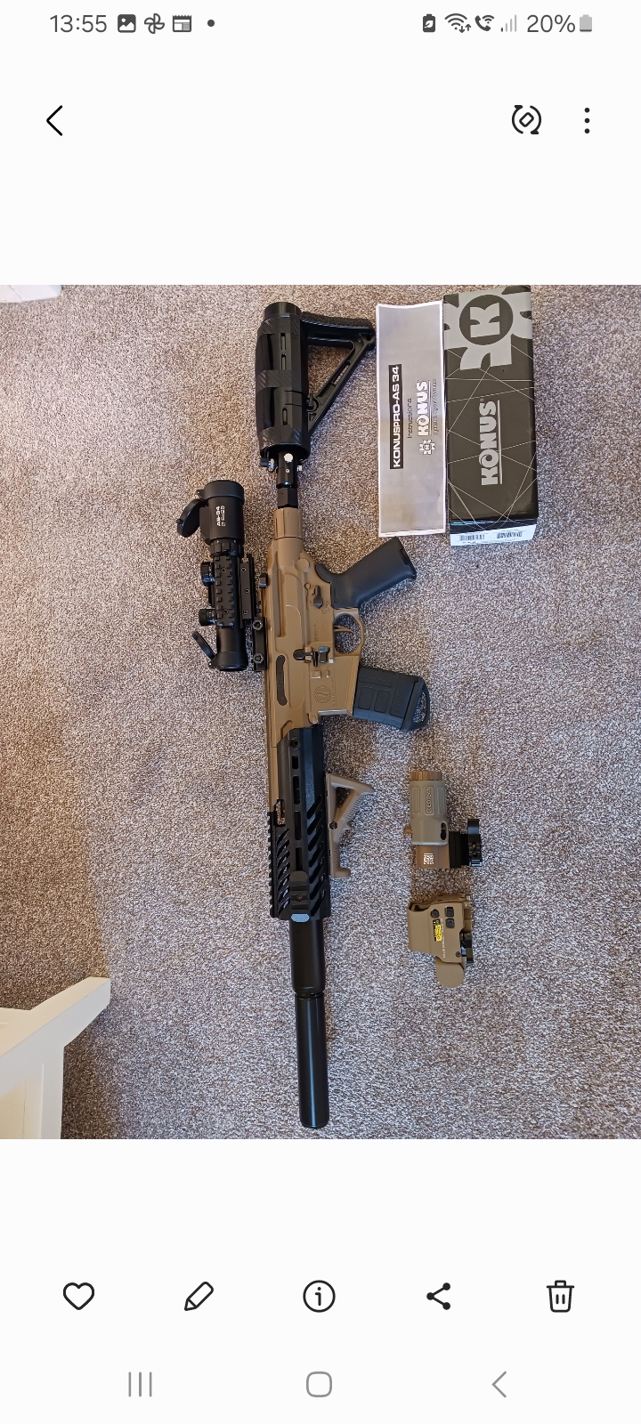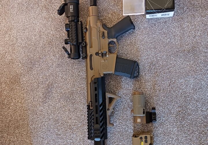 Customised Sig Rattler pcp for sale . Now Inc ,Konus Pro AF34 2-6×28 tactical scope. High quality assault rifle, comes with 1100psi regulated pcp system, £200 pounds worth of military Ecotech g33 red dot and 3 x magnifier that clicks to the side when not using. 3 x 30 round belt mags with rubber protection covers + an additional 4 , 30 round belts. AR 15 magpul grip + AR15 combat stock, adjustable. Soft cheek piece can be removed easily. Rifle shoots more accurate and powerful with the pcp system around 700 fps. Can still shoot co2 , comes with original stock., also original iron sights boxed. Comes in Nuprol hard case also supplied with original box, up front there is a fitted multi function weapons light. All as new , excellent quality from Sig, made in Japan. Whole kit cost £800… Bargain ! .Collection only