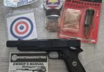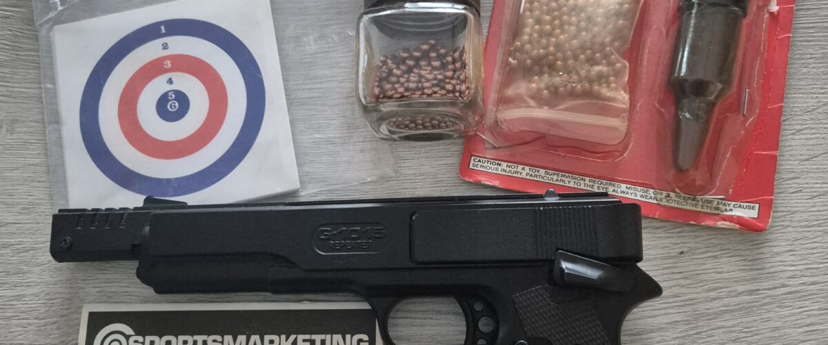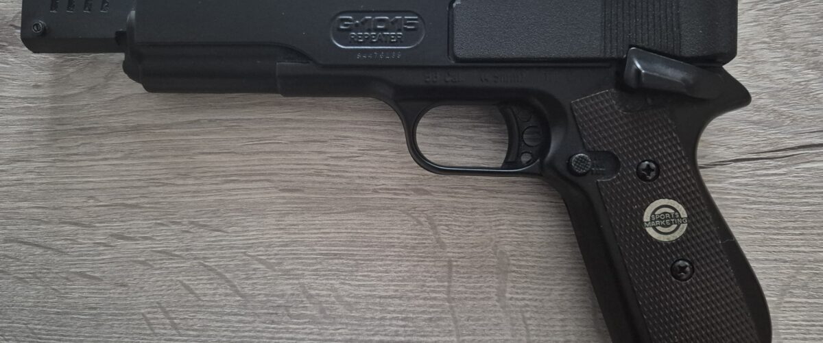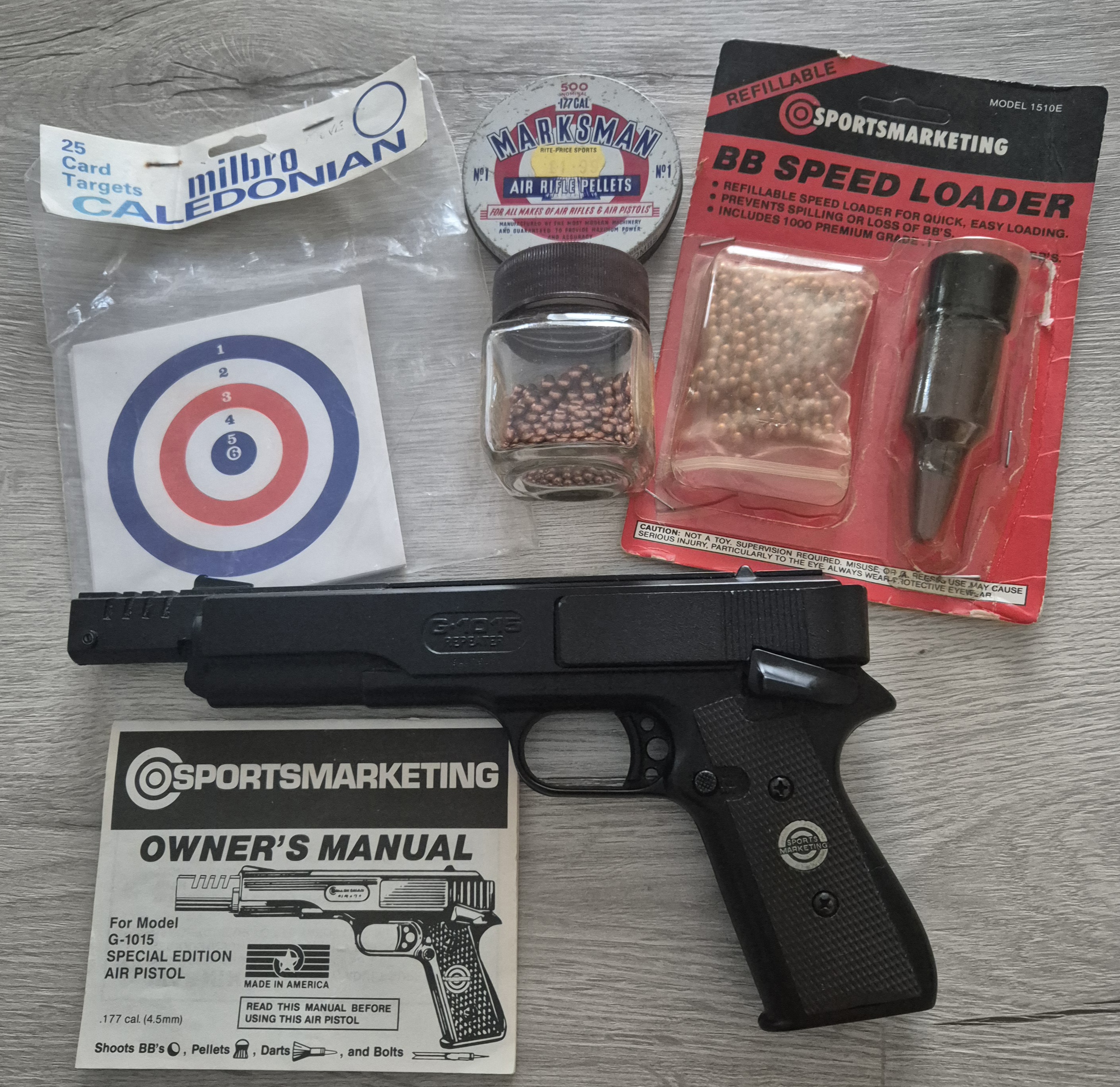 Original packaging not included but the item comes with the original owner’s manual, BB Speed Loader, some BBs, a part used tin of pellets and a packet of 25 Milbro Caledonian card targets. See photograph 1.