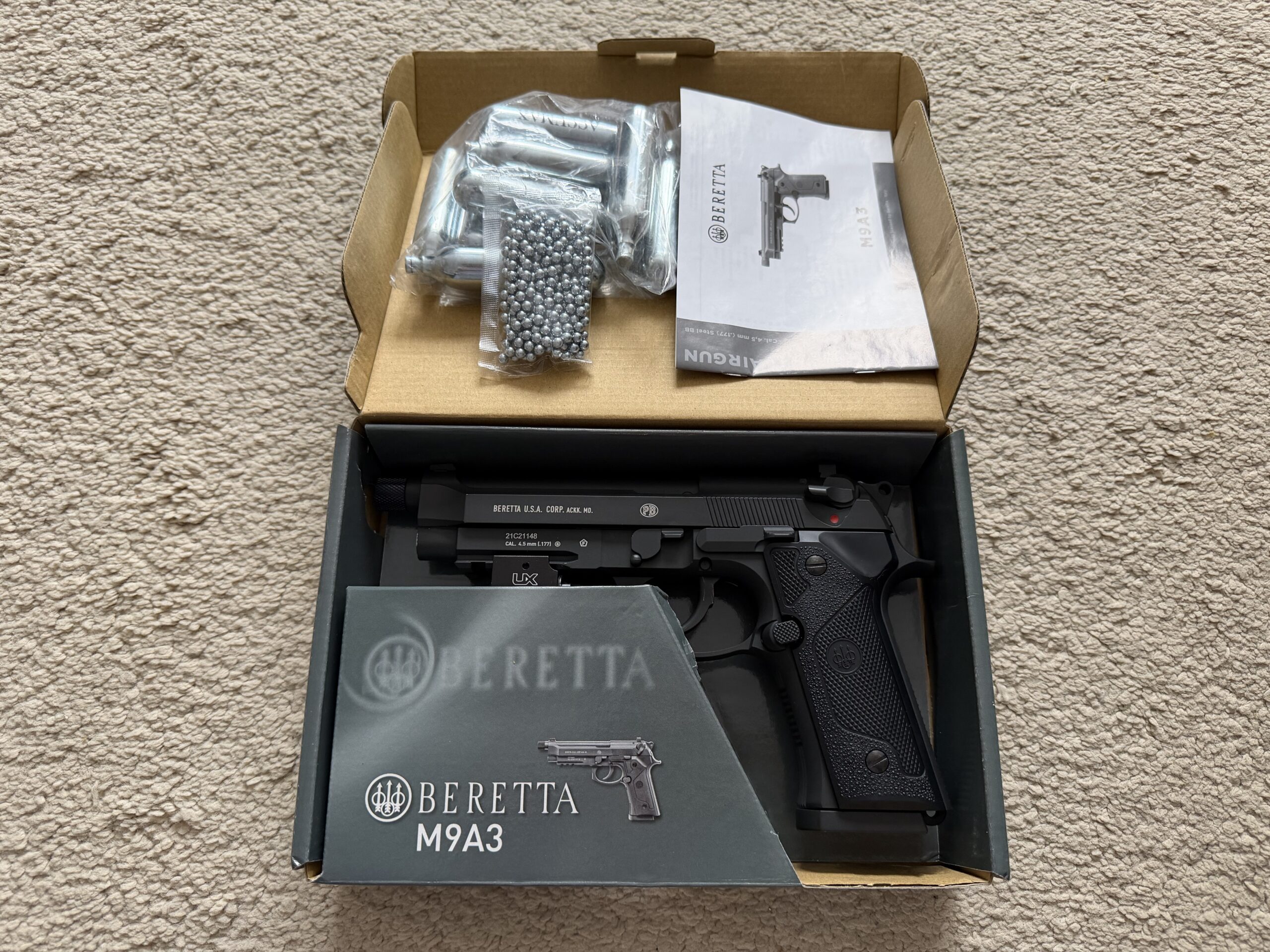 The original box and carry case is included, along with a pack of steel BBs and 8x CO2 Canisters