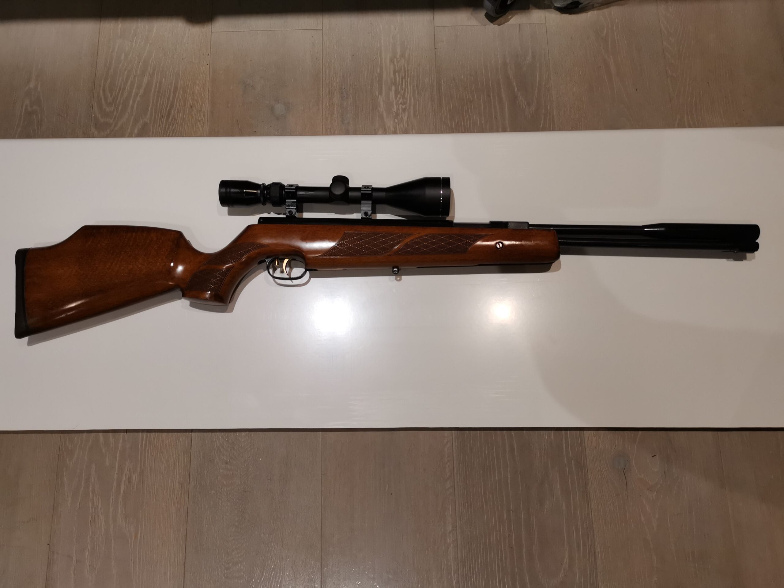 In very good condition light use only you can tell .22 lovely walnut stock with original 4x40 scope and gun slip with original hands in great condition.